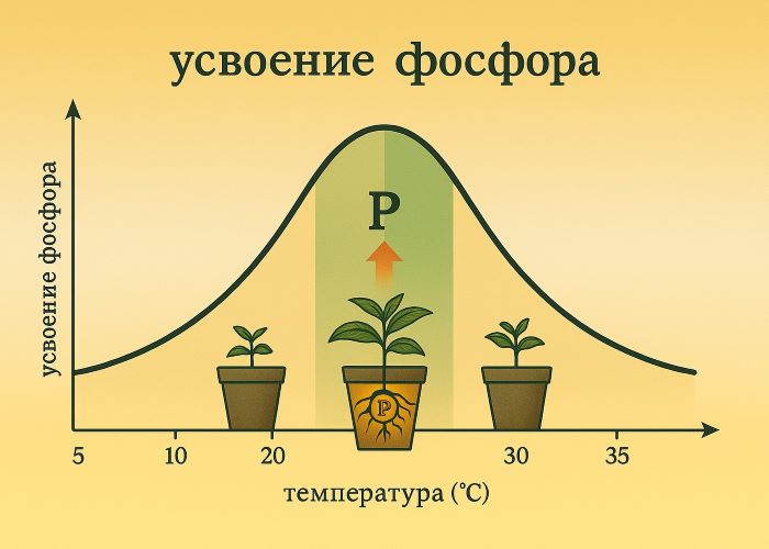 Температура корней — ключ к тому, чтобы фосфор действительно работал. Даже если его в почве или растворе достаточно, холод или жара могут полностью заблокировать его усвоение.