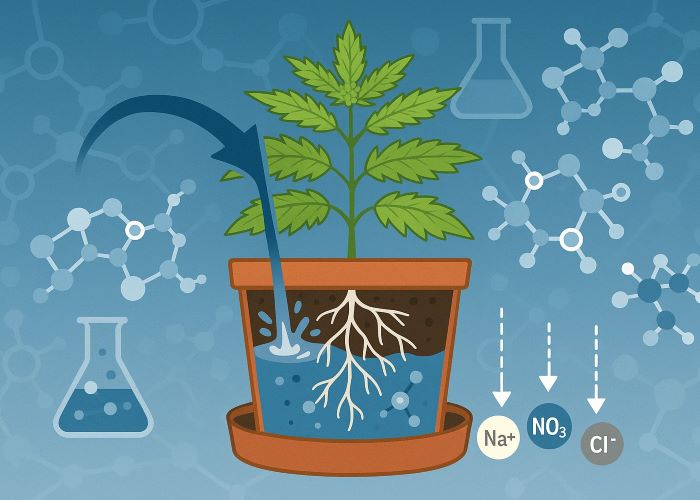 Одновременно в субстрате начинает вымываться избыток минеральных солей. Особенно это актуально, если на протяжении цветения использовались солевые удобрения: к финалу их остатки могут накапливаться в почве, кокосе или любом другом носителе. Это повышает риск, что часть этих соединений — особенно нитраты и фосфаты — окажется в тканях растения. А при сгорании они дают резкий, горький привкус, делают дым «грубым» и портят общее впечатление от вкуса.