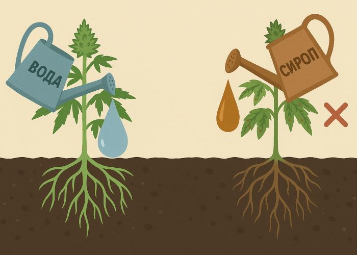 Добавление стимуляторов и "сладких добавок" в водуПопытка «подкормить» растение в последние дни мелассой, сахарными сиропами, ароматизаторами или стимуляторами кажется заманчивой: мол, шишка станет слаще, ярче, душистее. Но все работает наоборот. Такие добавки увеличивают влажность субстрата, создают питательную среду для патогенов, могут спровоцировать плесень и оставить посторонние запахи, не связанные с природным терпеновым профилем.